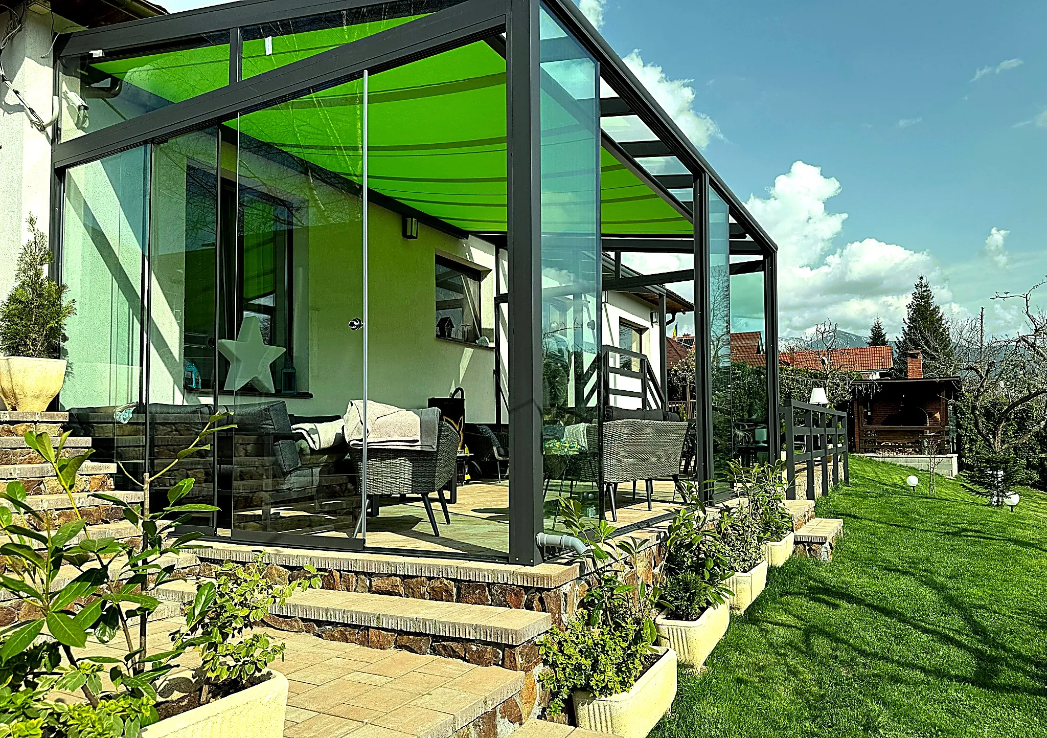 Profitez de vues spectaculaires tout au long de l’année depuis la terrasse ouverte ou la terrasse fermée avec murs en verre.